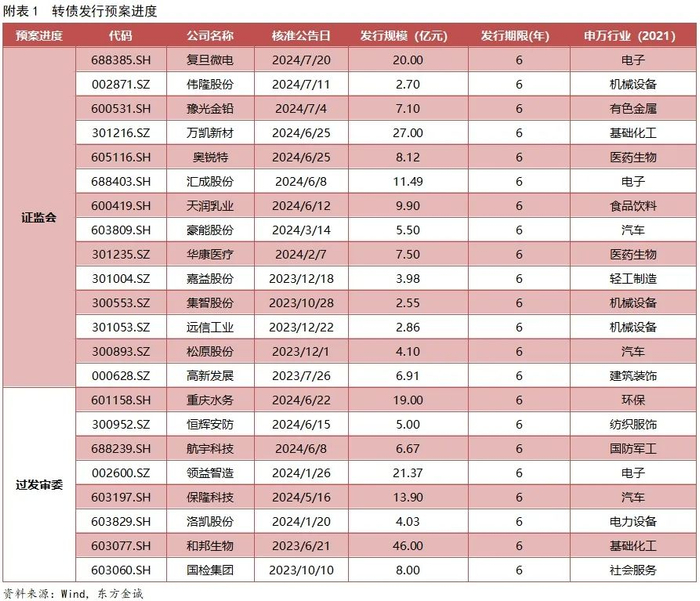 上周,复旦微电发行可转债获证监会注册批复。截至7月19日,共计14只转债通过证监会核准待发,合计119.71亿元,共计8只转债过发审委,合计123.98亿元(见附表1)。
