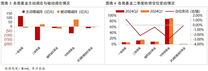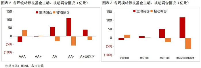 由于基金持有转债规模为市值口径,因此我们将持仓变化拆分为价格变化导致的被动调仓与持有量变化导致的主动调仓两部分,发现,二季度被动调仓与主动调仓呈现显著负相关。二季度期间,转债市场受到新“国九条”下部分正股退市风险冲击,叠加二季度末弱资质转债评级下调风险的影响,转债市场风格显著分化,高评级、大盘转债显著跑赢中低评级、小微盘转债,AAA级与大盘转债(跟随沪深300)受益于价格上升,基金被动增持38.03亿元、18.55亿元,而AA-级、A+及以下评级与小微盘转债(跟随中证2000及其他)价格跌幅较大,基金被动减持57.12亿元、22.77亿元与64.09亿元。