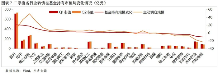 • 持有结构上看,二季度AA-级与小微盘转债获最多主动增持,分别达到110.35亿元、118.81亿元,主要由于二季度末信用评级已大多披露完毕,短期内实质性利空出尽,基金对前期低价券下跌潮中部分资质较弱但信用风险较小的低价券抢先博弈价格修复所致。行业结构上,电力设备、电子、汽车受到最多主动增持,非银金融与农林牧渔被减持规模居前。