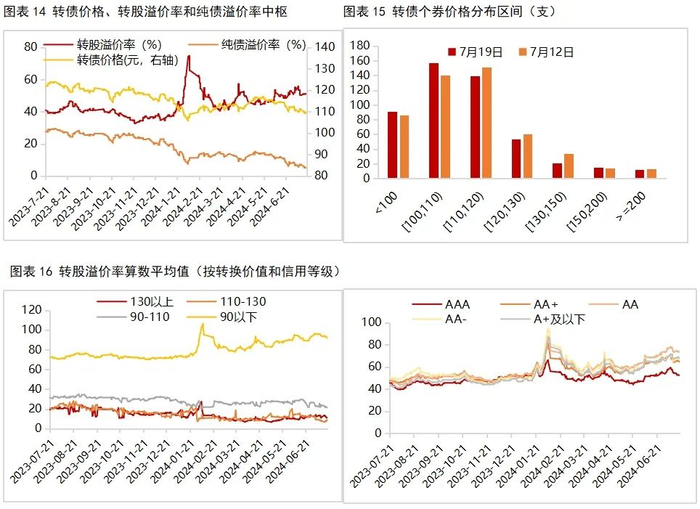 上周,转债市场个券价格下降,估值抬升。转债价格方面,上周,全市场转债价格算术平均值114.54元,较前周下降1.88元,中位数为109.74元,较前周下降1.16元。转股溢价率方面,上周,全市场转债转股溢价率算术平均值和中位数分别为72.88%、51.10%,较上周上升0.33pcts、0.92pcts,其中转换价值90-110区间转债估值下降2pcts,评级AAA级转债估值下降1pcts;纯债溢价率方面,全市场转债纯债溢价率算数平均值和中位数分别为11.50%和5.40%,较前周下降2.04pcts、1.59pcts,其中,纯债价值80-100区间转债纯债溢价率下跌2pcts,评级AA与AA-转债的纯债溢价率下跌2pcts。