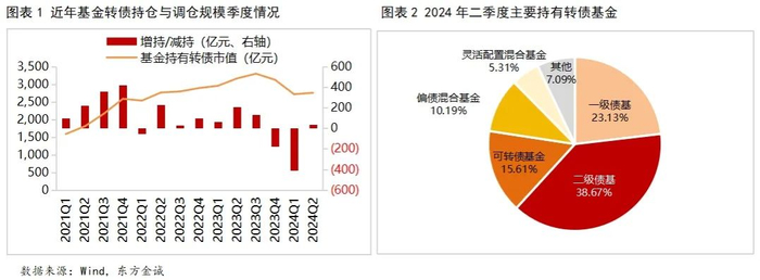 • 2024年二季度,基金转债持仓规模2760.94亿元,较一季度末增加40.36亿元,实现止跌回升。拆分来看,一级债基二季度份额有所下降,但在信用债、利率债收益率不断压缩的背景下,开始加仓债性转债增厚收益,二季度主动增持规模达121.27亿元,是二季度基金转债持仓回升主因。二级债基与可转债基金主动减持规模较大,转债仓位有所降低。