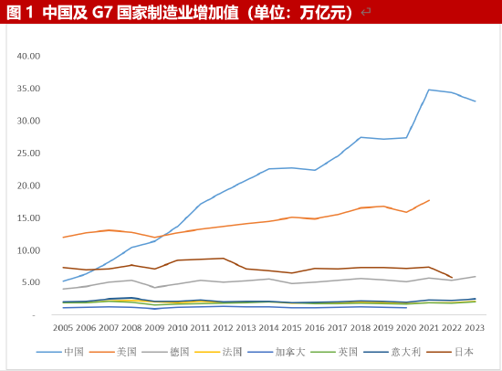 制造业大国驱动经济高速发展。改革开放40余年以来,我国经济实现了高速发展,在短短的几十年时间内基本完成了欧美发达国家几百年走过的工业化历程,其中,制造业成为了我国经济增长的重要支撑力量。我国制造业大国主要体现在规模体量大、门类体系全、供应链管理高效。规模体量方面,2023年,我国工业增加值达到39.91万亿元,其中,制造业增加值达到33万亿元,规模连续14年居世界首位,占全球制造业增加总值的比重稳定在30%左右,是美国制造业增加值的1.9倍,德国的5.5倍,已成为名副其实的世界第一制造业大国;门类体系方面,我国已拥有41个工业大类、207个工业中类和666个工业小类,建立了独立、完整的现代工业体系,是全世界唯一拥有联合国产业分类中全部工业门类的国家;供应链管理方面,我国已形成从原材料采购到产品制造再到配送物流的完善供应链体系,高效的供应链管理提高了生产效率、减少了成本,提升了中国制造产品的竞争力。