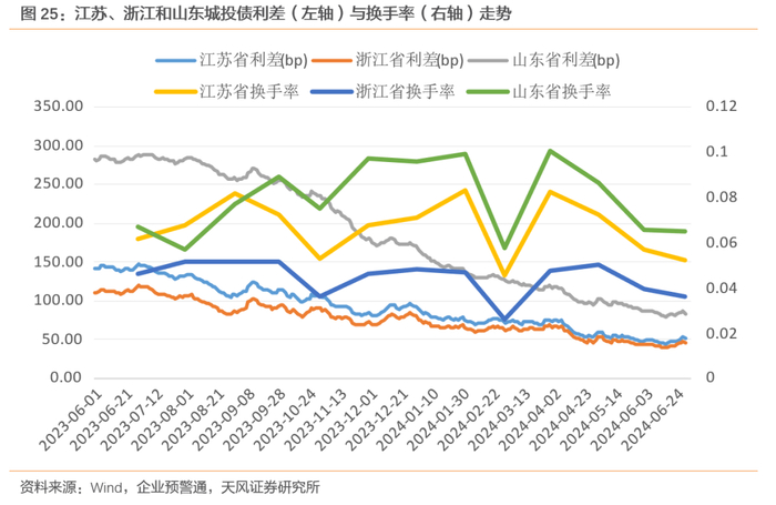 首先来看江苏、浙江和山东,可以直观看出,换手率越高的地区,利差的压缩的速度越快。在山东城投债换手率从6%上升至10%的过程中,利差大幅压缩超过150bp。在城投信用资质比较接近的江苏和浙江,也能看出这一特点,浙江城投债换手率较江苏长期处于低位,其利差压缩程度也小于江苏城投债。