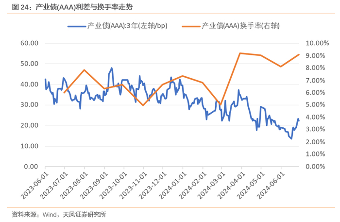 根据上文换手率分析,高隐含评级产业债换手率在2024年后出现了一次明显跃升,以产业债(AAA)为例,可以看到在换手率提升后,利差出现了一段较为明显的收缩。其流动性与利差呈现一定负相关,但利差变动可能存在一定滞后性。