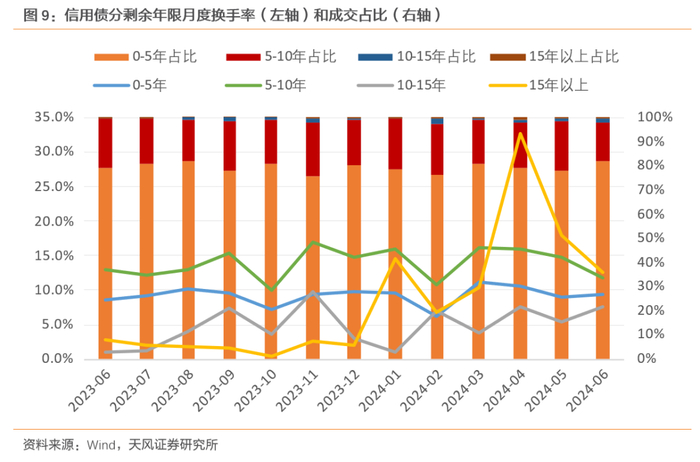 分剩余年限来看,市场更多在交易0-5年剩余年限信用债,其成交占比接近80%,其次是5-10年。具体来看换手率,5-10年的剩余年限信用债流动性较高,其换手率在14%左右波动;10-15年剩余年限的换手率最低,但今年也略有上升。今年以来15年以上超长债换手率大幅上升,从2023年的不足3%,最高跃升至今年4月的32.8%。这可能与今年超长债发行放量,市场对于新券发行交易的热情高涨有关。