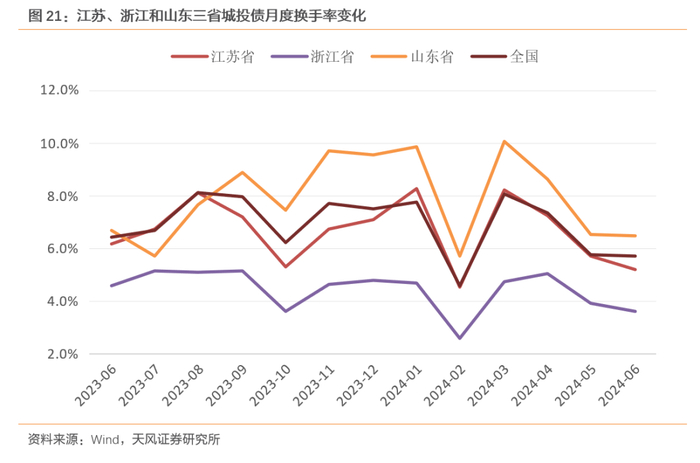 城投债分地区情况,我们关注存续规模前三位的江苏、浙江和山东以及成交活跃的重点省份。