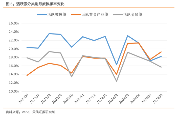 如果统计活跃券(当月有成交的债券),城投债的流动性则强于非金产业债和金融债,但换手率较去年有所下降,处在波动下降的趋势中;今年来非金产业债换手率略高于金融债,并呈波动上升趋势。活跃金融债和整体金融债的流动性差异不大,或说明金融债中活跃券的占比较高。