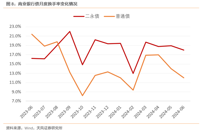 金融债细分方面,我们关注成交占比最大的商业银行发行的普通债和二永债,普通债换手率波动较大,且较期初大幅下降,流动性在波动减弱;二永债换手率则在18%附近波动,大部分时间高于普通债。