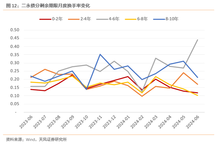 对金融债进行细分,我们关注二永债的换手率情况,其中剩余期限4-6年换手率在波动上升,其他期限二永债流动性较稳定,8-10年的换手率波动较大。