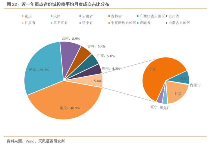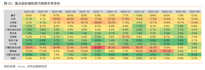 分地区来看城投债,存续规模靠前地区的换手率较为稳定;天津、云南持续被市场关注,今年的流动性持续维持在相对高位。