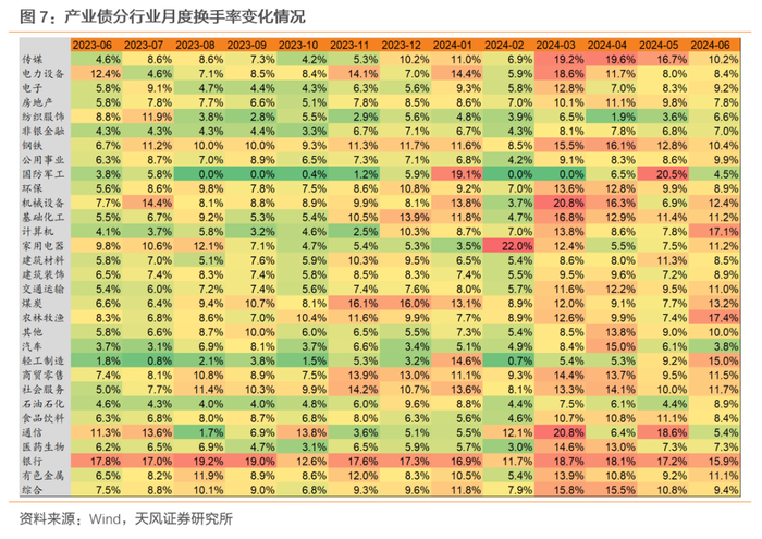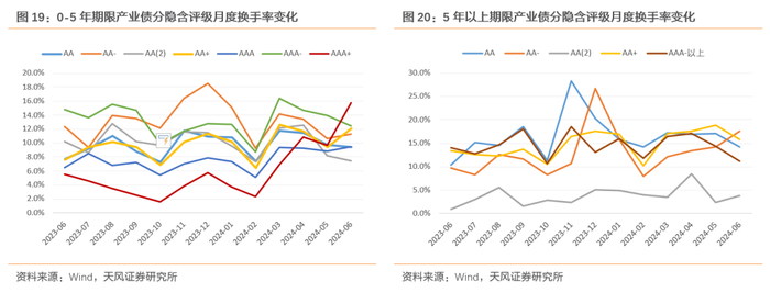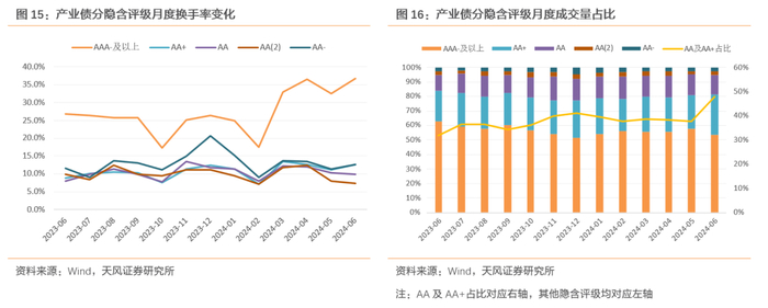 剩余期限5年以下的产业债中,AAA+的换手率在2024年2月后大幅上升,并在6月高于其他等级产业债,AAA+的产业债行业分布为公用事业、 非银金融、石油石化和交通运输。剩余期限5年以上的产业债中,AA(2)的流动性最弱,行业分布主要在建筑装饰。