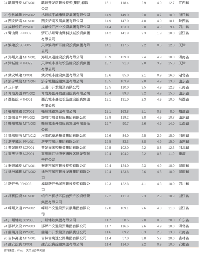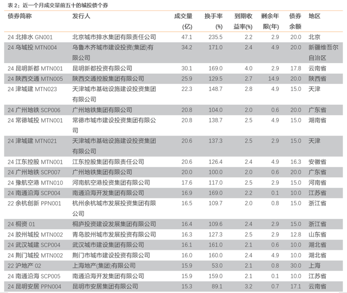 具体来看近一个月成交活跃的城投债个券。市场成交活跃前50的城投债个券中,收益率基本在2%-6%之间,剩余期限多在4-6年之间,地区分布上浙江、山东、天津和云南较多。24北排水GN001、24乌城投MTN004、24昆明新都MTN001的换手率较高,分别为235.5%、171.0%和169.0%。
