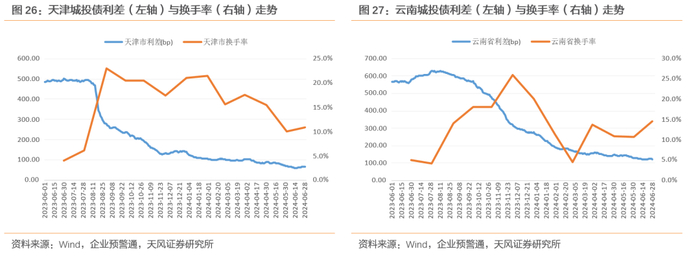 同样的,在重点省份中的成交活跃地区天津和云南,在其城投债换手率明显抬升后,对应利差出现了斜率陡峭的压缩。尽管后续换手率有所回落,但相较其他地区仍处在高位,未来可持续关注其换手率上升与利差压缩之间的关系。