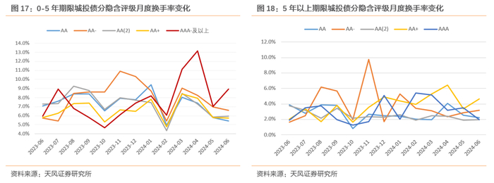进一步分期限来看,剩余期限5年以下的城投债中,AAA-及以上高等级的换手率在2024年2月后有一段大幅上升,并在此后持续高于其他等级城投债;而剩余期限5年以上的城投债换手率变化不明显,AA+等级的换手率相对较高。