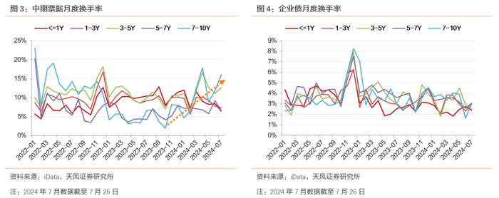 信用债中中期票据流动性高于企业债。2022年以来,7-10Y中票平均换手率为10%,企业债为4%,中票流动性明显高于企业债。从趋势上来看,2024年上半年7-10Y中票流动性整体上行,2024年4月达到阶段高点,为18%;企业债则整体较为稳定。