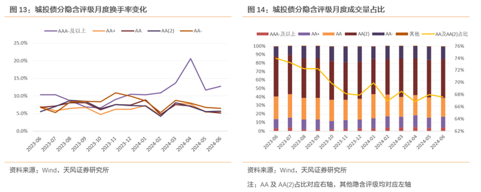城投债方面,AA(2)、 AA和AA-低等级成交占比较高,AAA-及以上高等级成交占比较小。近一年来,AA及AA(2)成交占比呈现波动下降趋势;AA+、AAA-及以上的高等级成交占比则逐渐上升。换手率情况,2023年6月至2023年末各隐含评级换手率差异不大,多在10%以内。2024年以来,AAA-及以上的高等级换手率呈现快速上升趋势,尤其在今年4月达到20.6%,大幅超过其他等级,近两个月有所回落,但仍在10%上方。