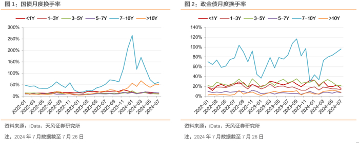 分期限来看,其中7-10Y换手率显著更高。观察国债和政金债月度换手率变化,剩余期限7-10年债券流动性显著较高。国债换手率在2023年底2024年初达到阶段高点,2023年12月和2024年1月分别为207%和265%,随后略有回落,但整体仍在2022年以来的相对高位。政金债流动也以7-10Y为主,近两年换手率平均在74%左右。