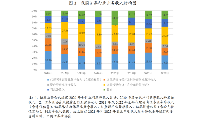 随着证券市场规模逐步扩大,证券公司资产规模逐年增长;2023年,证券公司业绩表现一般,全行业实现收入同比有所增长,但净利润规模同比下降。同年,证券公司收入结构同比发生较大变化,证券投资收益占比明显回升。