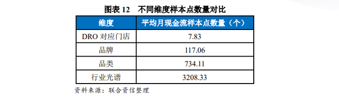 图表12展示了不同维度下的平均月现金流样本点数量,其中按DRO对应门店和品牌两个维度进行取样的平均样本规模明显不足,按品类维度进行取样的平均样本规模虽有所扩大但仍难以进行有效的统计分析,而按行业光谱取样,平均每个行业光谱分组有3208.33个按月取样的数据样本点,样本规模大幅扩大,其体现出的统计特征足以支撑后续的分析及测算。