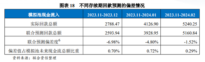 图表18展示了我们的预测值和实际表现的一些数值差异。结合前文提到的对于预测效果的评估原则,从合理性原则看,我们的偏差值占未来预计回款的比重均在1.00%以内;从谨慎性原则看,我们的预测回款均不超过实际回款;从稳定性原则看,我们预测的偏差度随着时间的推移,呈现稳中有降的趋势。综上所述,我们的基准现金流预测实现了较好的预测效果。