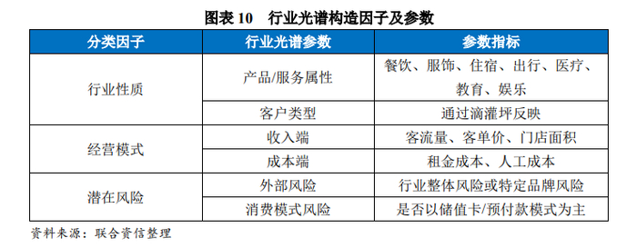 在行业光谱的构建上,我们的主要原则是将替代性较强的品类在光谱内归为同一行业,替代性弱或无替代性的划分为不同行业,使得同一行业的消费场景、业务模式面临的风险是类似的,而不同行业间是有较大差别的。为了建立行业光谱,我们对每个品类的行业性质、经营模式、潜在风险三大方面进行考量,并设置了六项参数来对上述方面进行精细划分,以此将各品类进行分组。图表10展示了建立行业光谱分组所考量的因子,及影响该因子的定性/定量分析指标。