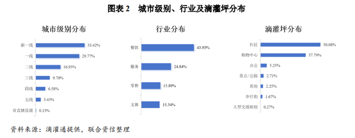 截至2024年2月末,通过滴灌通实现的累计投放额已超过40亿人民币。从地区分布上看,所投资的实体门店遍布全国200多个城市,且主要集中在新一线城市(占比33.42%)和一线城市(占比29.77%);从行业分布上看,所投资的实体门店分布在餐饮、零售、服务、文体四大行业,涉及上百个品类;特别地,从滴灌通定义的滴灌坪[1]概念来看,所投资实体门店主要分布于社区(占比50.08%)和购物中心(占比37.79%)两类滴灌坪。