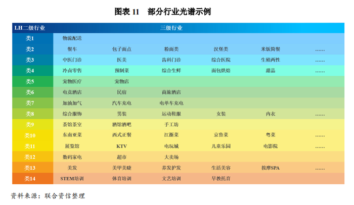 由于行业为我们分组的核心指标,因此我们对线下消费行业的商业模式与典型特征进行整理与分析,以期能通过若干核心维度将线下消费行业进行尽可能精确的划分。我们从业务模式、经营风险等角度对滴灌通给出的品类(即三级行业)进行了重新归类,构建了一套创新性的行业分类体系,并通过不同颜色区分各行业的风险差别,从而形成我们的可视化行业划分系统——行业光谱。