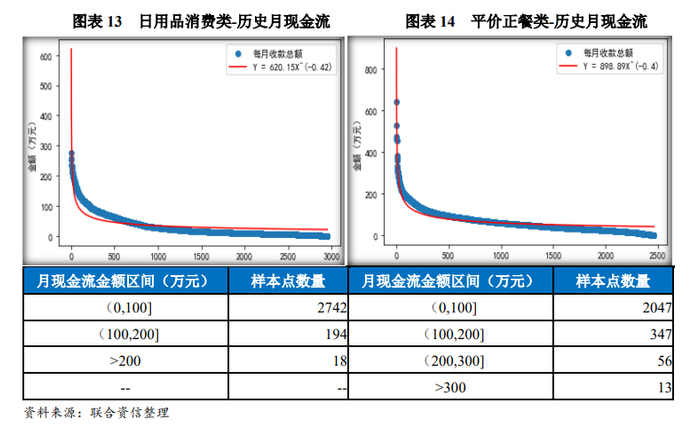 图表13和图表14展示了从滴灌通全部资产中选取的两种行业历史回款样本分布特征(按由高到低的顺序排列),以及其和幂律分布的关系。我们分别绘制了行业光谱中日用品消费类和平价正餐类两个行业的历史月现金流数据点(蓝色点),并根据该数据集拟合了幂律分布曲线(红色曲线),可以看出二者的重合度极高。此外,从两幅图中,我们也可以看出历史回款数据曲线明显的“尖峰厚尾”的特征,并且从对应的现金流收入分布表可以看出,在样本点数量的分布上,两个行业处于高现金流区间的样本点占比均很低,绝大部分样本点集中在低现金流区间,更进一步从数据上体现了样本数据集的幂律特征。