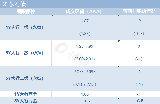 今日银行债成交较清淡,成交收益附近窄幅波动,临近尾盘,成交level略有上行。截至收盘,二级多成交在估值-1bp附近,较上周五下行约1.5bp;永续短端多成交在估值-1bp附近,永续长端多成交在估值-1到估值-2bp附近,较上周五下行1.5bp左右;商金多成交在估值-1.5bp附近,整体较上周五下行0.5-1.5bp左右。5Y大行二级落在2.095附近,5Y大行永续落在2.13附近;3Y大行二级落在1.98附近,3Y大行永续落在2.00附近;3Y附近商金落在1.925附近。今日二级长端券商和基金主要配置,二级短端买盘主要是基金;永续长端基金、理财和资管皆有配置,永续短端主要是券商、基金参与;商金债买盘多为基金和农商行。
