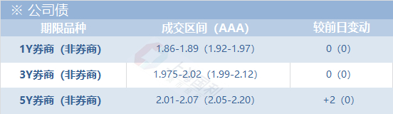 公司债今日交投一般,收益先下后上,至收盘也基本持平周五。年内方面,普通可质押买盘主要是基金和理财,1Y附近头部券商成交在1.86-1.9,基金和理财均有参与。1-2Y方面,普通可质押交投较活跃,买盘主要是基金,券商资管出券较多。2-3Y,普通可质押基金和理财均有参与,3Y附近头部券商成交在1.97-2,买盘主要是理财。更长期限成交较活跃,买盘主要是基金和保险,券商出券较多。