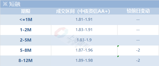 今日资金均衡,短融交投情绪一般,跨年短券收益下行2bp,年内基本持平周五;月内短券AAA主要成交在1.8-1.91区间,买盘主要为理财、基金和农商行,其中好名字的11D的沪机场股在1.88的位置被理财收入囊中;9月底到期的短券成交在1.83-1.91区间,买盘主力是基金,其中好名字的46D的电网在1.83的位置成交数笔;四季度AAA成较在1.83-1.90区间,买盘主要为基金和理财,好名字的券主要成交在1.85-1.87区间,如114D的北京国资在1.87的位置被基金带走;跨年一季度AAA成交在1.87-1.96区间,买盘主要为基金、理财、券商资管和少量农商行,好名字的券主要成交在1.87-1.92区间,如好名字的154D的光大集团成交在1.87,其他资质的券如221D的粤环保在1.945的位置被基金和券商资管收入囊中;跨年二季度AAA成交在1.89-1.98区间,电网主体的券在1.89-1.90区间成交数笔,267D的济南高新成交在1.96的位置。