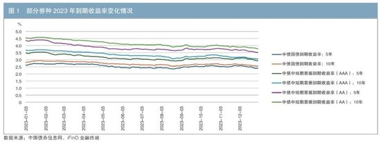 二是债券市场利率不断下行,降低了市场融资成本。以10年期国债、AAA级和AA级中短期票据为例,2023年末其到期收益率较年初分别下降27BP、63BP和77BP(见图1),较大程度降低了相关主体的融资成本和偿付压力,带动了市场融资需求。