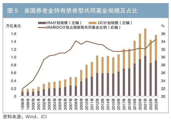美国个人养老金的发展也是债券型基金规模得以快速增长的另一重要原因。20世纪90年代以来,美国个人养老金快速发展,而债券型基金是其重要的投资标的之一。美国养老金包含个人养老金计划(IRA计划)和缴费确定型计划(DC计划)4。截至2023年末,美国养老金持有的债券型共同基金达1.56万亿美元,占同期债券型共同基金规模的34.4%,是推动债券型基金增长的重要力量(见图5)。