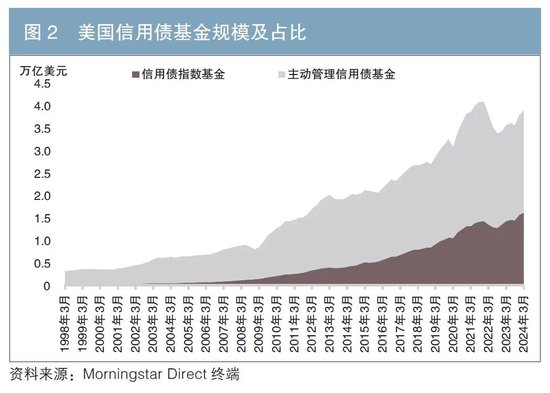 截至2024年3月末,美国信用债指数基金3规模为1.62万亿美元,占美国信用债基金的41.5%。从增速上看,近10年其CAGR为14.6%,远高于主动管理信用债基金(同期为3.9%)。