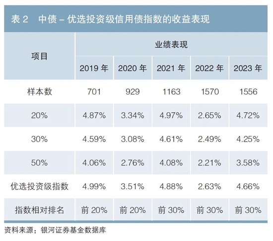 笔者观察2017—2023年中长期纯债基金业绩排名变化情况,前一年业绩在前50%的,次年仍在前50%的概率为58.2%,甚至在部分相邻年份出现业绩排名负相关的现象,这意味着对于业绩持续优异的主动管理债券基金的筛选难度较大。相较之下,部分被动管理产品脱颖而出,具备较好的业绩持续性。以中债-优选投资级信用债指数为例,该指数过去5年每年的业绩表现均超越了市场排名前三分之一的中长期纯债基金(见表2)。