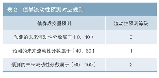 得到个券未来30天的流动性预估分数之后,将其映射为3个等级(0~2),转化为多分类模型,展示债券之间的相对流动性。具体规则如表2所示,预测分数越大代表流动性越好。