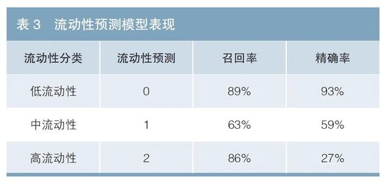 模型训练结束后在测试集上进行评价,以2023年11月25日—12月25日为测试集时间窗口,用训练好的模型对存续的104万样本进行预测,并转化为预测的流动性等级。真实的流动性等级根据专家经验设置,小于100手等级为0,在100手至10000手之间等级为1,大于10000手等级为2(见表3)。本文使用机器学习模型常用的准确率、召回率、精确率这3个指标来评价: