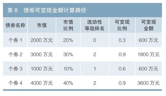基于FRL模型的预测结果,可以预测个券在未来流动性的等级。设置对应的可变现比例并计算债券资产组合的可变现金额。依据专家经验,对流动性等级为0、1、2的债券分别设置为0.3、0.6、0.9。
