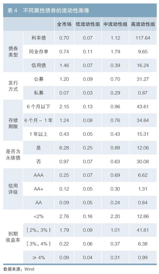 如表4所示,各维度的统计结果表明预测的流动性等级越高,真实的平均交易量越高。且满足市场对债券流动性的共识,比如利率债的交易活跃度明显高于信用债,公募债的交易活跃度显著高于私募债,随着存续期限的增加交易活跃度降低。从到期收益率来看,高流动性组中收益率在[2%,3%)的债券交易活跃度最高。此外,债券市场上永续债的交易活跃度指数高于非永续债,因为永续债大都为信用风险低的金融永续债,整体上交易较活跃。