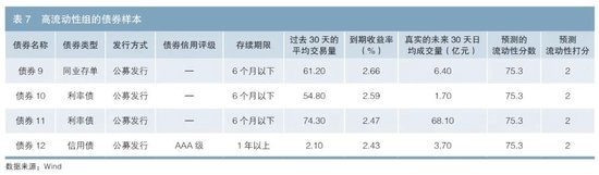 表5、6、7分别展示3个流动性组中部分债券样本。在每个流动性等级池中,公募发行、存续时间在6个月以下的债券更活跃。中低流动性组中,非利率债、永续债较活跃;高流动性组中,利率债、非永续债较活跃,到期收益率分布稳定,信用评级较高。历史流动性对未来流动性的影响也较大,一般过去流动性越好,未来流动性也会越高。如债券7与债券10,基本属性类似,均为公募发行且存续期限在6个月以下的利率债,到期收益率的差异较小,但过去流动性差距较大,模型及时抓住该动态信息并反馈到最终的流动性等级分类中。