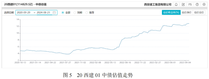 2020至2024年期间,西安建工共存续2只债券,其中20西建01(起息日期2020-09-29,发行利率5.40%;到期日期2023-09-29,实际兑付日:2023-10-09)其估值自2022年下半年起期不断上升,2022年12月初突破10%。