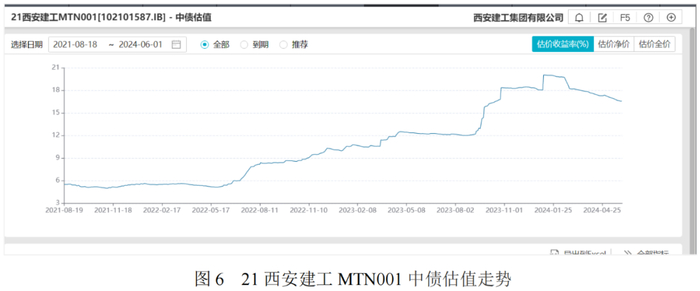 21西安建工MTN001(起息日期2021-08-18,发行利率5.50%;到期日期2024-08-18,实际兑付日2024-08-19)其估值自2022年下半年起期不断上升,2023年1月初突破10%,2024年1月初突破20%。