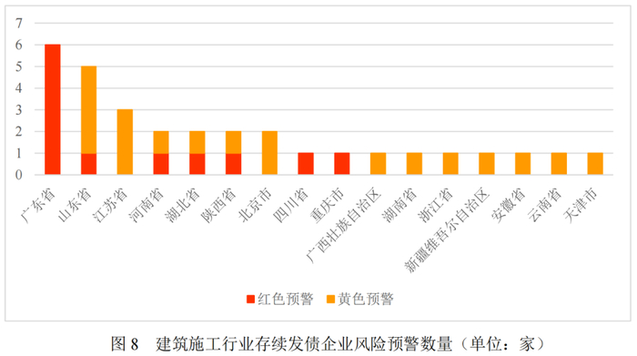 根据联合债市信用风险投研平台(https://ic.lhratings.cn/login)显示,建筑施工行业存续发债企业中目前有12家红色预警企业,19家黄色预警企业,主要分布于广东、山东、江苏等省,建议重点关注财务风险、财务弹性、舆情等。