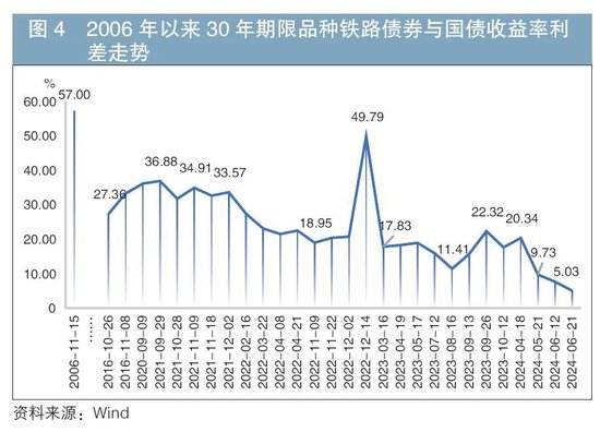 2024年以来至6月末,债券市场利率延续震荡下行趋势,中长期债券与国债利差收窄,国铁集团加大中长期债券尤其是30年期债券的发行力度,中期票据的票面利率与国债的利差不断突破前低,10年期、30年期债券票面利率最低分别为2.35%、2.53%,利差最低仅为5BP(见图4),均创历史新低。