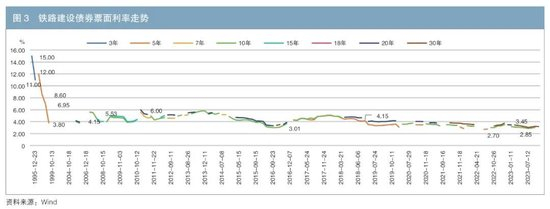 1995—1997年,票面利率为8%~15%;1998—2021年,票面利率降至3%~7%;2022—2023年10月,票面利率向下突破3%,其中5年期利率降至2.7%,10年期利率降至2.85%(见图3)。