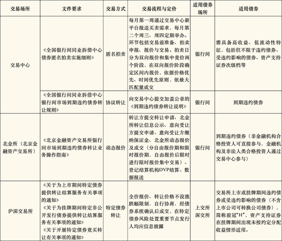 在外汇交易中心匿名拍卖机制出台前,违约债券交易转让存在多项制度性难题,典型情况为违约债券无法像正常状态债券那样进行交易过户,交易双方只能以线下协议签署完成收购转让,处置周期长难度大。而在外汇交易中心现行机制下,违约债既可以协议转让,也可以匿名拍卖。中国东方资产管理股份有限公司自2021年起陆续依托外汇交易中心匿名拍卖及协议报价机制就到期违约债分别达成多笔资产支持票据及中期票据交易。交易机制优化简化了交易流程,实现了有效价格发现及资本要素配置,表1对我国违约债交易机制进行了梳理。