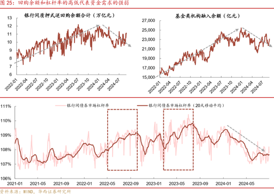 需求端,主要是非银加杠杆带来的资金融入需求。当短端资产套息空间扩大,资金需求趋于上升,但同时也加大了资金面反转的风险,可以通过非银机构融资资金规模、质押式回购余额和杠杆率来观察当前资金需求强弱。资金需求旺+供给端边际收敛,可能带来资金面波动的放大;而资金需求较低时,难以出现较大波动。