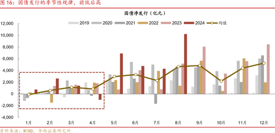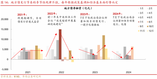 地方债方面,发行节奏的季节性规律并不强,而是与经济基本面和政策基调相关度较高。