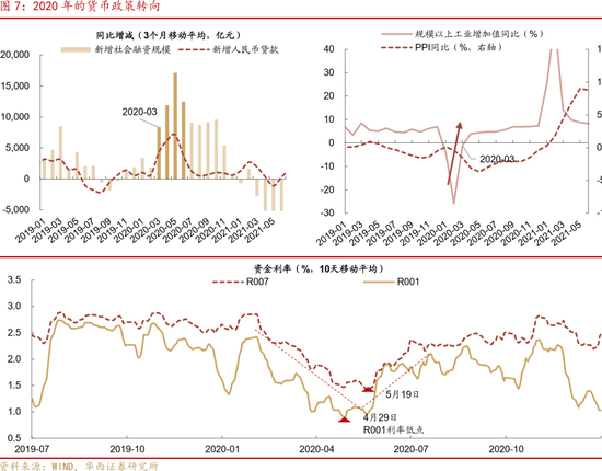 2.2.2.2020年:疫情后经济恢复,货币政策回归常态2020年3月中旬-5月中旬,受货币宽松及宽松加码预期影响,银行间隔夜利率多位于1%左右甚至1%以下,期间R001平均值仅1.11%。2020年二季度,中国经济从新冠疫情中快速恢复,是货币政策边际收敛的前提。2020年3月开始,新增社融同比明显多增,3-5月新增社融同比增量合计5.1万亿元,平均每个月同比多增1.7万亿元,宽信用效果显现,其中3-5月企业中长期贷款同比多增8575亿元。2020年4月工业增加值同比增速转正,达到3.9%;5月地产销售、地产投资、基建投资当月同比增速已经基本恢复至正增长,甚至达到或超过疫情前的水平。这期间,生产恢复领先于需求恢复,因而PPI环比在6月才转正,晚于生产端数据的改善。而海外疫情仍在升温,主要经济体经济重启进程仍受疫情影响,经济恢复进程落后于中国。货币政策从超宽松转为边际收敛,有几个关键的操作和措辞变化:一是5月22日政府工作报告中明确提到“加强监管,防止资金‘空转’套利”。5月末恰逢地方债发行高峰,央行未投放中长期流动性,而是投放期限较短的7天逆回购,且在逆回购到期后进行缩量续作,使得5月下旬到6月上旬银行间利率快速向逆回购利率收敛,隔夜利率从5月中旬低于1%的水平迅速反弹到5月末的2%以上;二是6月到7月,央行官员表态货币政策边际收敛,回归常态。6月18日,央行行长易纲在陆家嘴论坛上提到,“疫情应对期间的金融支持政策具有阶段性,……要关注政策的‘后遗症’,总量要适度,并提前考虑政策工具的适时退出”。6月28日,学者余初心发表《正确认识应对非常事件的货币政策》,指出“积极防范金融风险并提前考虑政策工具适时退出,其目的是为经济金融长期持续稳定健康运行夯实基础”。7月10日,上半年金融统计数据新闻发布会上,货币政策司副司长郭凯表示“要认识到利率适当下行并不是利率越低越好,利率过低也是不利的,利率如果严重低于和潜在经济增长率相适应的水平,就会产生套利的问题,产生资源错配的问题……所以利率适当下行但也不能过低”。三是7月30日政治局会议指出货币政策要更加灵活适度、精准导向。2020年7月30日政治局会议中的货币政策表述,加入“精准导向”的表述,进一步强调政策结构性,以及“保持货币供应量和社会融资规模合理增长”,和重新强调对制造业融资的支持,反映出疫情之后,随着经济恢复正增长,货币政策也在回归常态。8月6日央行二季度货币政策执行报告,对政治局会议的货币政策表态进行了进一步阐释,其中专栏四“怎样看待全球低利率”分析了利率过低带来的负面影响。总体来看,2020年货币政策从疫情期间的宽松回归常态,上演了连续的转变信号。首先是3月开始新增社融同比大幅改善,4-5月经济数据改善;而后5月下旬开始,高层会议和央行相关官员等监管层面陆续表态货币政策适时退出,并且提到个别金融领域出现杠杆率回升和资金空转现象,确认了货币政策回归常态。