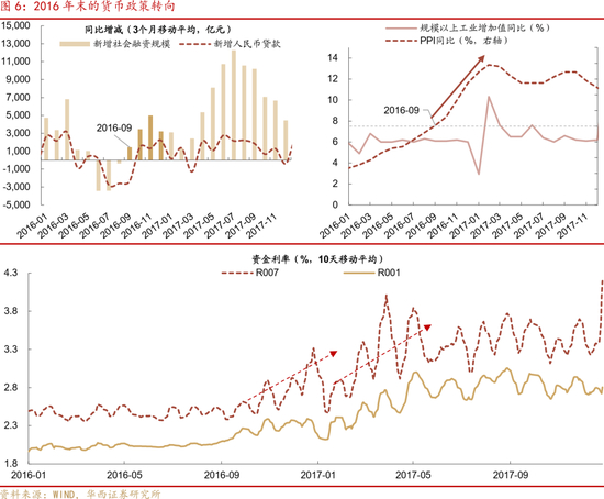 总体来看,2016年货币政策从宽松到中性偏紧,首先是8月开始新增社融大幅同比正增长,7-10月PPI环比持续改善,9月PPI同比转正,结束了连续54个月的工业品通缩周期。而后8-9月央行重启14天和28天逆回购,资金面波动加大,货币政策出现转向信号,12月中央经济工作会议对货币政策定调转变,确认转向。